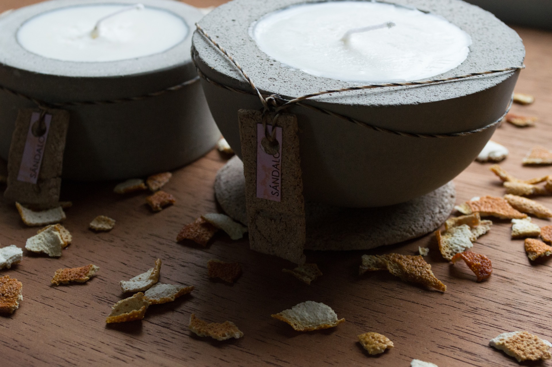 Velas de soja en recipiente de concreto.